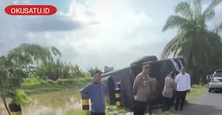 OKU TIMUR – Bus yang berisi penumpang keluarga Jemaah Calon Haji (JCH) Kabupaten OKU Timur terguling di badan jalan.
